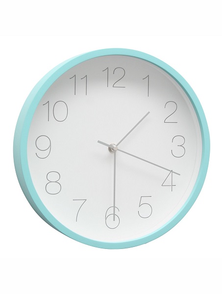Stilvolle Wanduhr aus Holz mit blauer Kante und weißem Hintergrund mit graufarbigen Ziffern und silberfarbigen Uhrzeiger. Sorgfältig verarbeitet und mit hochwertigem Klarglas geliefert, erhältlich in 1 Größe.